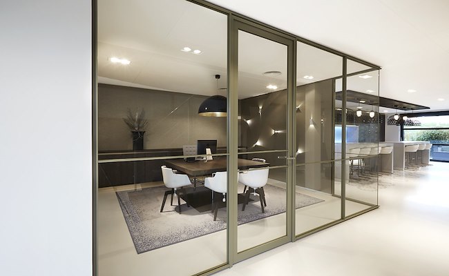 Natuurlijke en krachtige uitstraling bij een glazen systeemwand.