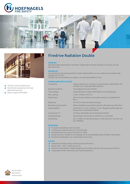Met de Firedrive Radiation Double (EW) brandwerende automatische brandwerende schuifdeuren richt Hoefnagels Fire Safety zich op projecten, waar zowel kennis van brandwerendheid en regelgeving, als van gevel- en deurconstructies een zwaarwegend item zijn.