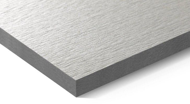 Gevelplaat in vezelcement met gekleurde kern en geschuurd, mat oppervlak.