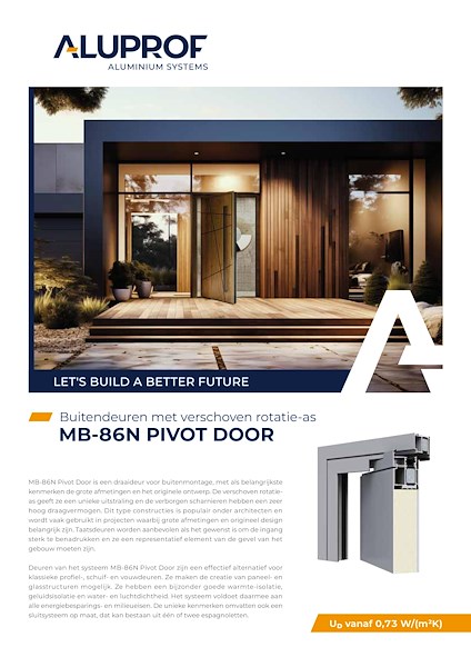 Deuren van het systeem MB-86N Pivot Door zijn een effectief alternatief voor klassieke profiel-, schuif- en vouwdeuren. Ze maken de creatie van paneel- en glasstructuren mogelijk. Ze hebben een bijzonder goede warmte-isolatie, geluidsisolatie en water- en luchtdichtheid. Het systeem voldoet daarmee aan alle energiebesparings- en milieueisen. De unieke kenmerken omvatten ook een sluitsysteem op maat, dat kan bestaan uit één of twee espagnoletten.