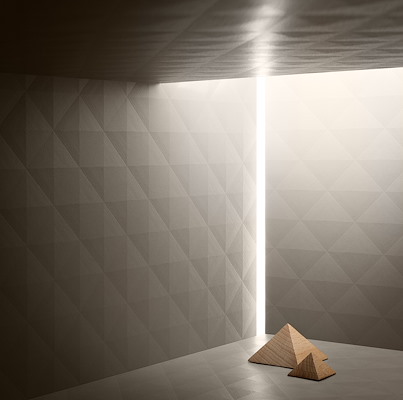 heeft een driedimensionale structuur die speelt met licht en schaduw. Technologische innovatie bij Cleaf heeft het mogelijk gemaakt om de vorm van piramides te vertalen naar decoratief plaatmateriaal. Interieur- en meubelontwerpen krijgen hiermee een eigentijdse, geometrische uitstraling. In combinatie met een stoere beton of een ingetogen, matte hout structuur ontstaat een spannende materialenmix.