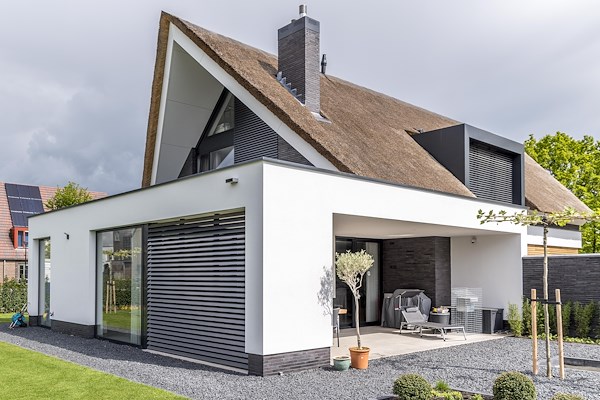 Een lamellenwand op het terras biedt zonwering, bescherming tegen wind en privacy