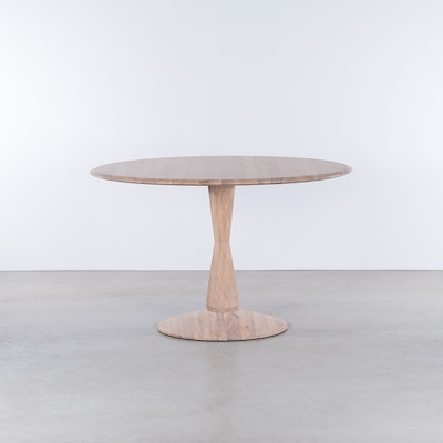 is een ronde eettafel van massief hout met een sierlijke vorm. Een bijzondere tafel, die direct opvalt door zijn design. De tafel heeft een centrale poot van massief hout. Een tafel die eenvoudig oogt, maar siert in de details.