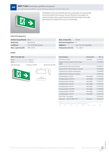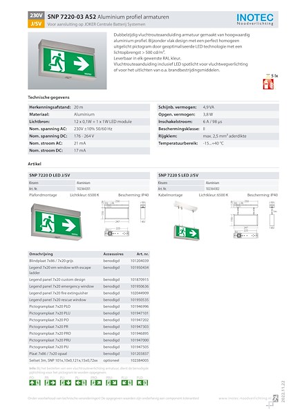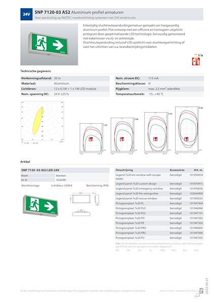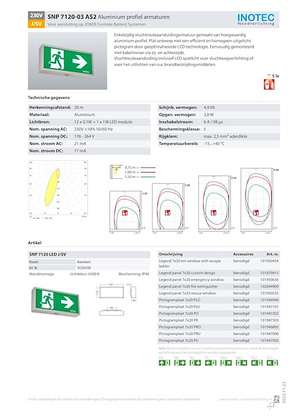 Pictogram conform NEN-EN-ISO 7010 in 20 meter (7120 en 7220), 35 meter (7135 en 7235) en 60 meter (7160 en 7260) leesafstand conform NEN EN 1838, NEN EN 60598-2-22 en NEN EN 55015