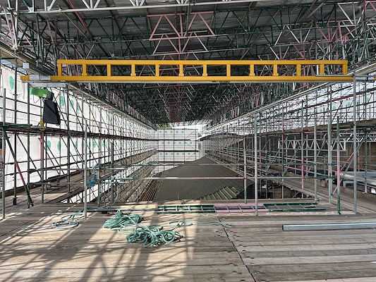 Rolbrug gemonteerd aan steigerbuis voor renovatie van gebouwen