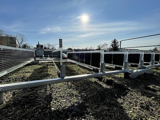 Met de verticale bifacial PV-units van Over Easy Solar is het nu makkelijker dan ooit om op een groendak zonne-energie op te wekken. Dit