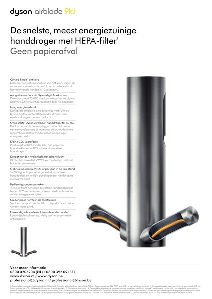 Voor grotere instellingen en intensiever gebruik biedt Dyson de Airblade 9kJ aan. Dit model combineert kracht met energie-efficiëntie en verbruikt slechts 9 kilojoule per droogbeurt. Dankzij de snelle droogtijd van 10 seconden en het dubbele HEPA-filtersysteem, is de Airblade 9kJ niet alleen efficiënt maar ook uitermate hygiënisch. Het strakke design van deze handdroger voegt bovendien een moderne touch toe aan elke sanitaire ruimte.