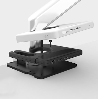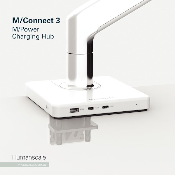 MC3 Charging Hub is een laadstation met USB-poorten type A/type C geïntegreerd in de voet van de monitorarmen van Humanscale en is dan ook compatibel met de elegante monitorarmen