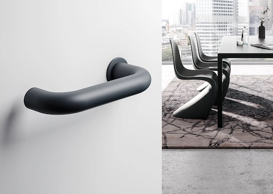 combineert HEWI polyamide en roestvrij staal voor een unieke, individuele pasvorm. Het platte rozet van roestvrij staal omvat een gekleurde inleg van polyamide en is beschikbaar in verschillende PVD-nuances zoals messing, koper, brons, en zwart chroom, wat nieuwe accenten op de deur plaatst.