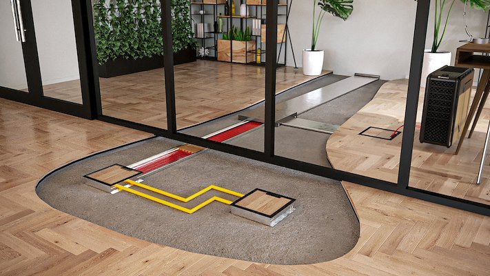 De VELOX® VIA is een compleet pakket voor renovatieprojecten. De vloergoten zorgen ervoor dat kabels zelfs na installatie gemakkelijk kunnen worden geleid.