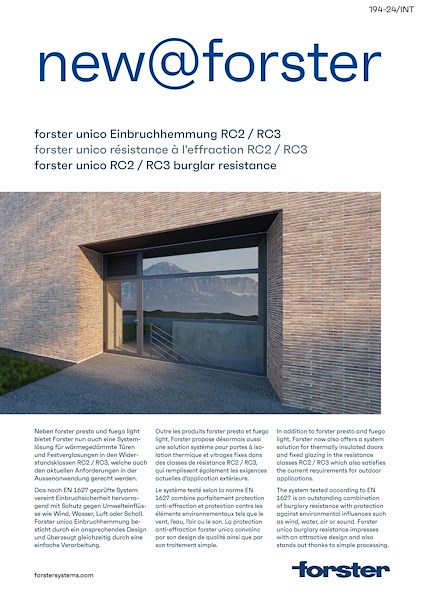 Forster biedt niet alleen forster presto en forster fuego light aan, maar vanaf nu ook een oplossing voor thermisch geïsoleerde deuren en vaste beglazing in de weerstandsklassen RC3 die ook voldoen aan de huidige eisen voor buitentoepassing.