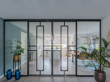 Een ware eyecatcher deze stalen dubbele schuifdeur met bijzondere glasindeling!