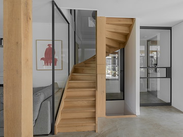 Stalen panelen, deuren en een vide rondom een houten trap