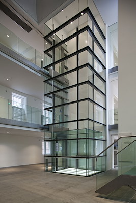 De stalen liftschacht kan worden omgeven door glazen wanden, wat zorgt voor een open en transparante uitstraling. Dit helpt niet alleen om natuurlijk licht in de ruimte te laten stromen, maar creëert ook een gevoel van ruimte en verbinding tussen de verdiepingen.