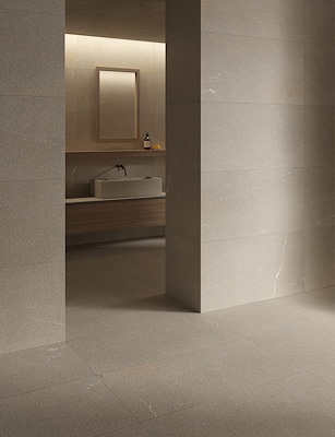 Eigentijds keramisch alternatief voor natuursteen met subtiele fossiele en minerale nuances.
