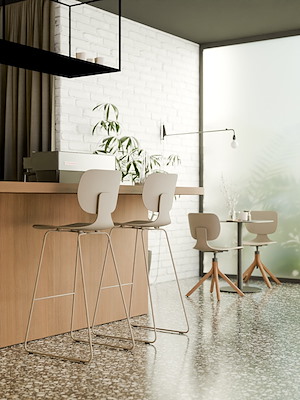 De CoMeet Recyclate stoel in de kleur Simply Taupe wordt geleverd in combinatie met een slede onderstel, vierpoot onderstel, barkruk en kruisvoet op wielen.