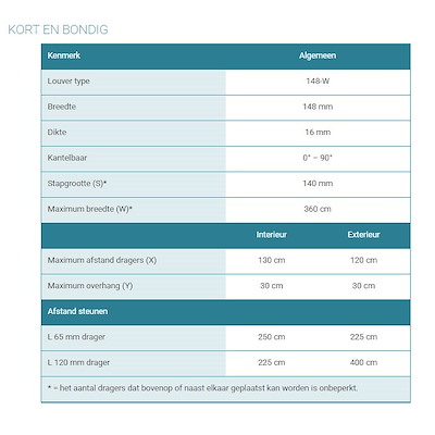 De 148-W lamel maakt gebruik van het L-systeem. Bij een exterieur toepassing met 148-W louvers mag de maximale afstand tussen twee dragers (X) 1200 mm zijn. Bij een interieurapplicatie is dit maximaal 1300 mm.