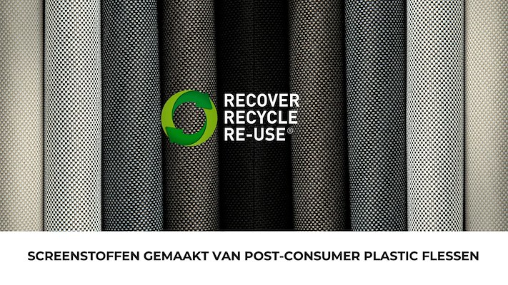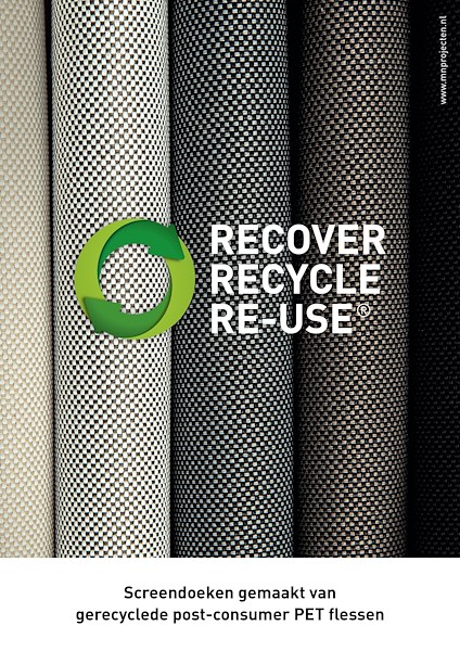 RE-USE® is een screendoek, gemaakt van 85% post-consumer PET flessen.