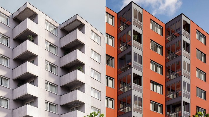 Om de gevels van verouderde gebouwen snel en met hoge prefabricage te renoveren, heeft de raam- en gevelspecialist Solarlux het modulaire systeem Ecoline M ontwikkeld. Dit systeem bestaat uit borstweringselementen die gekoppeld worden aan Ecoline glazen vouwwanden, resulterend in een solide modulair omlopend kozijn. Ondanks de omvang van de modules behouden de profielaanzichten en de statische dwarsbalken een smalle, verfijnde uitstraling, die bijdraagt aan een fraai gevelaanzicht. Bovendien is het systeem ontworpen met verborgen bevestigings- en afvoerniveaus, wat zorgt voor een strakke afwerking. Tijdens de planningsfase worden de exacte afmetingen en het aantal vouwelementen op maat geconfigureerd. De modules worden als geprefabriceerde eenheden op de bouwlocatie geleverd, waarna het borstweringglas en de vouwelementen ter plaatse worden gemonteerd. Dit modulaire ontwerp vermindert de montagetijd aanzienlijk en geeft minder overlast voor de bewoners.