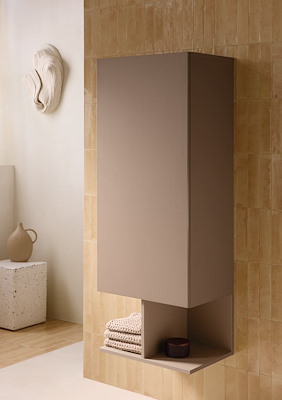 De badkamermeubels hebben een natuurlijk, door de natuur geïnspireerd kleurenpalet met tinten variërend van wit en aardse bruintinten tot antraciet. Speelse accenten worden gecreëerd door de gestructureerde oppervlakken. Als extra optie zijn er minerale wastafelbladen beschikbaar in drie tinten, wat extra diepte en authenticiteit aan het ontwerp geeft.