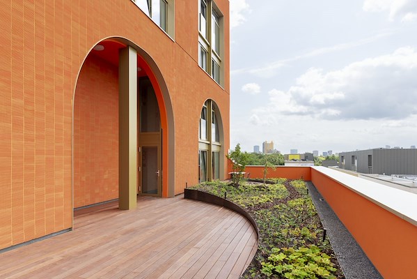met gebruik van StoEcoShapes een krachtige visuele identiteit aan het gebouw. Oranje vormt de basis, aangevuld met warm rood en een vleugje geel. Extra textuur werd toegevoegd met een uitgesproken ribbelstructuur, die tijdens het productieproces met de hand is aangebracht met een kam. De uitvoering werd met veel aandacht verzorgd door
