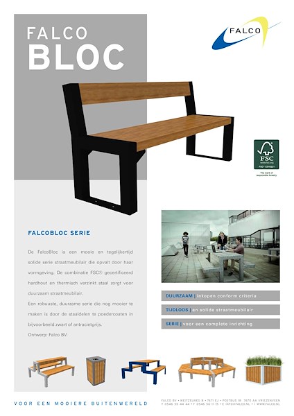 De FalcoBloc-serie is een strak vormgegeven lijn straatmeubilair, speciaal ontwikkeld voor architecten die op zoek zijn naar een duurzame en esthetisch verantwoorde invulling van de openbare ruimte. De combinatie van FSC®-gecertificeerd hardhout en thermisch verzinkt staal resulteert in een solide, onderhoudsarm en tijdloos product. De serie biedt een breed scala aan elementen, waaronder zitbanken (met en zonder rugleuning), picknicksets, tafels, plantenbakken en afvalbakken – allemaal modulair toepasbaar. Dankzij de mogelijkheid tot poedercoating in elke gewenste RAL-kleur sluit FalcoBloc perfect aan bij uiteenlopende ontwerpvisies. Ontwikkeld en geproduceerd in Nederland, voldoet deze serie aan hoge eisen op het gebied van duurzaamheid, circulariteit en kwaliteit – ideaal voor pleinen, schoolomgevingen, parken en stedelijke entrees.