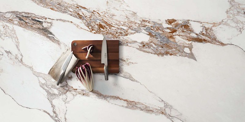 Eigentijds keramisch alternatief voor natuursteen met subtiele fossiele en minerale nuances.