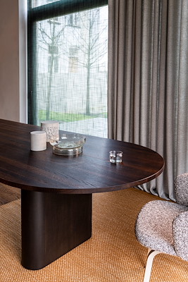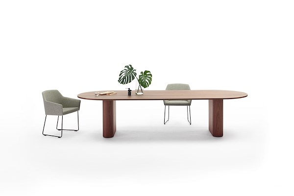 De kern van het ovale tafelblad is opgebouwd uit snelgroeiend populierenhout uit duurzaam beheerde bossen en is voorzien van een hoogwaardige laag eiken-, essen- of notenfineer. De tafel is voor meerdere doeleinden inzetbaar, bijvoorbeeld om aan te vergaderen.
