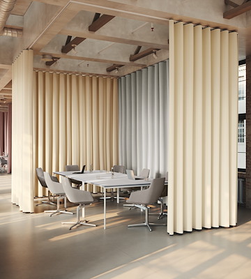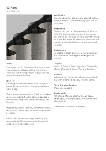 Waves is een akoestisch gordijn van Kvadrat Acoustics, ontworpen om de toenemende architecturale focus op adaptief hergebruik en de transformatie van industriële en commerciële locaties in multifunctionele ruimtes voor werk, cultuur en wonen te ondersteunen. Waves is ontworpen om naadloos te integreren in bestaande gebouwstructuren en biedt een flexibele akoestische oplossing die privéruimtes creëert, met een verhoogd akoestisch en visueel comfort, in grote ruimtes.