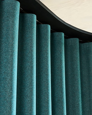 Op basis van gepatenteerde principes bestaat het gordijn uit drie of vier lagen, afhankelijk van de gewenste akoestische prestaties: een Kvadrat-textiel aan de voor- en achterkant met één of twee geluidsabsorberende lagen in de binnnenkant. Dit meerlaagse design biedt gerichte geluidsdempende eigenschappen en een onberispelijke golvende afdekking door ritmisch geplaatste gepatenteerde tapes en haken te integreren die de wrijving tussen de lagen verminderen. Het elegante, meerlaagse akoestische gordijn is leverbaar in zeven archetypische Kvadrat-stoffen, met een volledig scala aan kleuren en texturen: Divina 3, Steelcut Trio 3, Highlight, Divina MD, Divina Melange 3, Remix Flow en Twilight.
