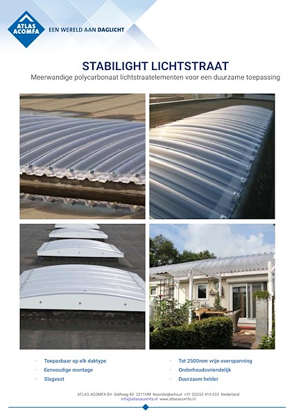 Stabilight bestaat uit gebogen polycarbonaat elementen die een vrije overspanning tot 2400mm aankunnen, zonder extra ondersteuning. Dankzij de meerwandige structuur is het materiaal licht in gewicht, maar toch stijf en sterk genoeg voor structurele oplossingen. De lichtstraten worden afgewerkt met PVC-foam kopschotten.
