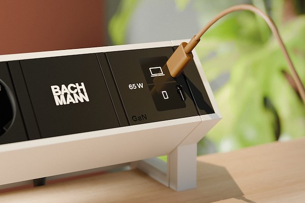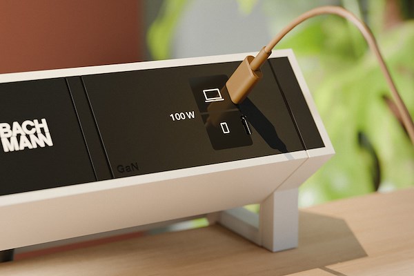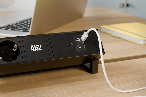 De 140 watt oplader beschikt over drie USB C poorten en is daarnaast verkrijgbaar als custom module, waardoor integratie in een bestaande BACHMANN tafelstopcontact mogelijk is. Ook achteraf eenvoudig te installeren.