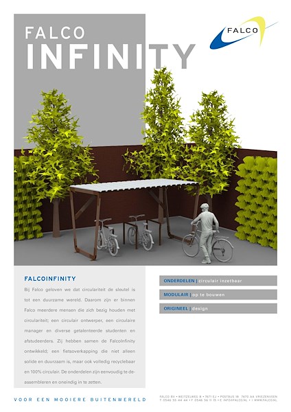 De FalcoInfinity is een circulaire fietsoverkapping die is ontworpen met het oog op duurzaamheid, hergebruik en toekomstbestendigheid. Deze overkapping combineert staal en FSC®-gecertificeerd hardhout tot een robuust, stijlvol en volledig recyclebaar geheel. Alle onderdelen zijn eenvoudig te (de)assembleren, waardoor materialen aan het einde van hun levensduur opnieuw ingezet kunnen worden — binnen Falco of elders in de keten.