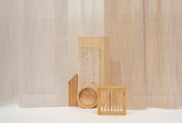Architectonisch en minimalistisch, maar tegelijk tactiel en nostalgisch: Mira verweeft het allemaal in een transparante gordijnstof.