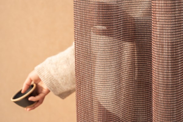 – een transparante gordijnstof van 63% gerecycled polyester FR – combineert een open rasterstructuur met een subtiel slub-effect, wat zorgt voor een natuurlijke, linnenachtige textuur dat met een knipoog verwijst naar de jaren zestig. De stof balanceert tussen orde en organische imperfectie. De bewuste onregelmatigheden brengen het raster tot leven, voegen beweging toe en versterken het tactiele karakter van een ontwerp dat zijn oorsprong vindt in de Scandinavische en Japanse tradities. Mira heeft een elementair, rustiek karakter dat puur en comfortabel aanvoelt. De stof verzacht en definieert ruimtes, terwijl ze een sfeer van minimalisme behoudt.