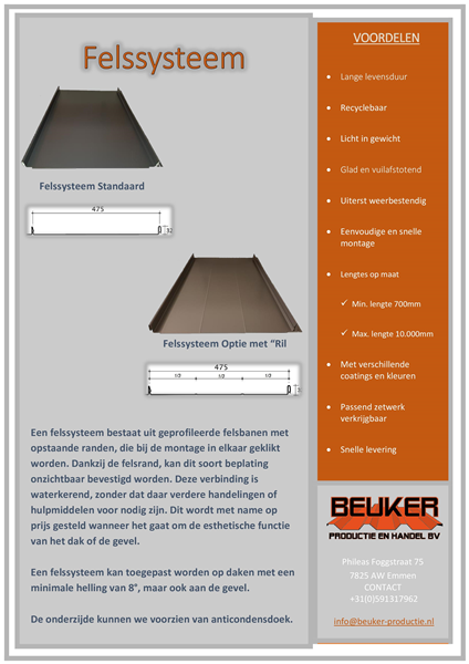 Een felssysteem bestaat uit geprofileerde felsbanen met opstaande randen, die bij de montage in elkaar geklikt worden. Dankzij de felsrand, kan dit soort beplating onzichtbaar bevestigd worden. Deze verbinding is waterkerend, zonder dat daar verdere handelingen of hulpmiddelen voor nodig zijn. Dit wordt met name op prijs gesteld wanneer het gaat om de esthetische functie van het dak of de gevel.