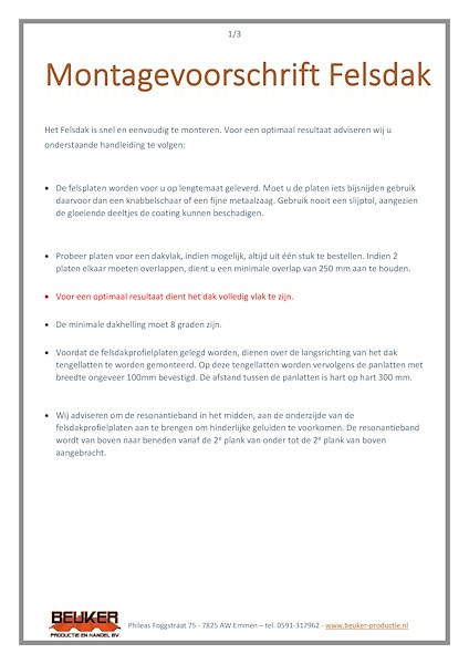 - Felssysteem platen worden bevestigd met behulp van zelfborende, roestvrijstalen schroeven 4,0 x 30 mm. Benodigd aantal schroeven: +/- 6 stuks per m².