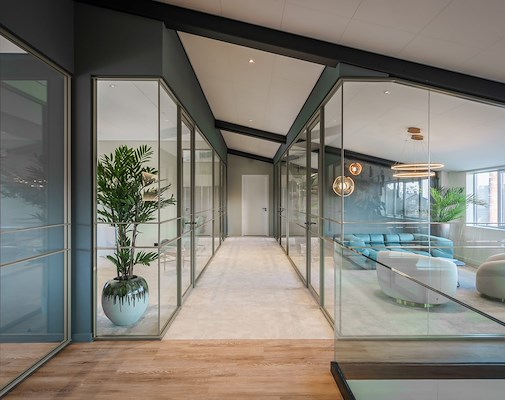 Natuurlijke en krachtige uitstraling bij een glazen systeemwand.