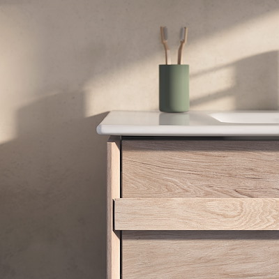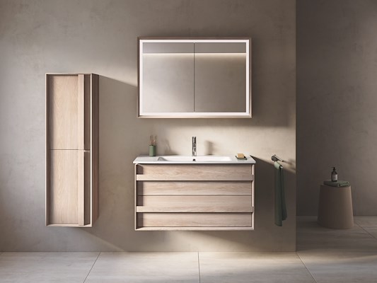 De serie biedt volop ruimte voor persoonlijke invulling. Ocavo is verkrijgbaar in drie houtafwerkingen — natuurlijk eiken, licht eiken en zwart eiken — elk met een eigen sfeer. De wastafelmeubels zijn te combineren met de keramische ME by Starck-wastafel of de fluweelmatte Vitrium-wastafel van mineraalgietwerk. Console-oplossingen, halfhoge kasten, spiegels en spiegelkasten met geïntegreerde ledverlichting maken het geheel compleet.