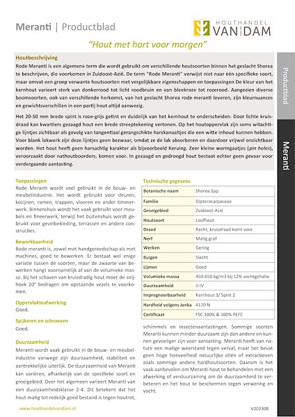 Bij Houthandel van Dam ligt de focus op West-Maleisische Meranti. Deze kwaliteit wordt gewaardeerd om zijn karakteristieke donkerrode kleur, stabiele eigenschappen en hoge verwerkingskwaliteit. Zoekt u juist een lichtere variant? Ook daarvoor bent u bij ons aan het juiste adres.