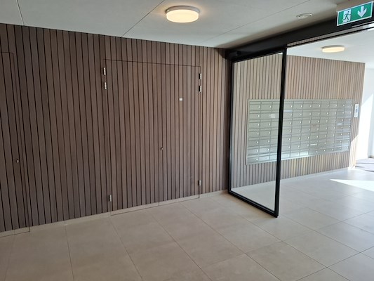 Obèche Noir® heeft een relatief lage volumieke massa, waardoor het licht van gewicht is. Hierdoor is het noodzakelijk om het hout van een brandvertragende behandeling te voorzien om aan de eisen van het Bouwbesluit te voldoen. Vraag naar de mogelijkheden voor uw project.