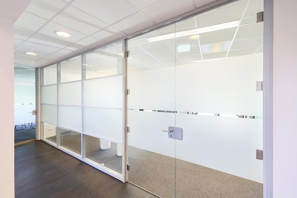 Voor optimale transparantie is de glazen deur ideaal. Deze hardglazen deur sluit perfect aan bij onze glaswanden. Toepasbaar in een zwevend profiel of verdiepingshoog.