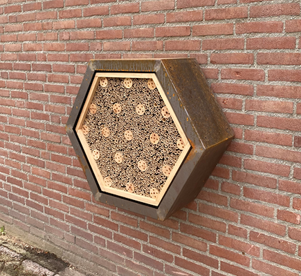 Het Hex insectenhotel is een modulair element van cortenstaal dat nest- en overwinteringsplek biedt aan solitaire bijen en andere nuttige insecten. De vulling van bamboe en geboord hout zorgt voor variatie in diameter en diepte. Geschikt voor wandmontage of vrijstaande plaatsing in tuin en projectomgeving. Een duurzame, onderhoudsarme oplossing die biodiversiteit zichtbaar integreert in elk ontwerp.
