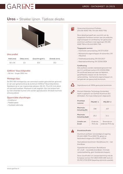 Uros wordt gemonteerd op de GARline® Base: een aluminium klikprofiel dat fungeert als dragende en maatvoerende achterconstructie. De Base maakt snelle montage mogelijk en zorgt voor een betrouwbare, blinde bevestiging.