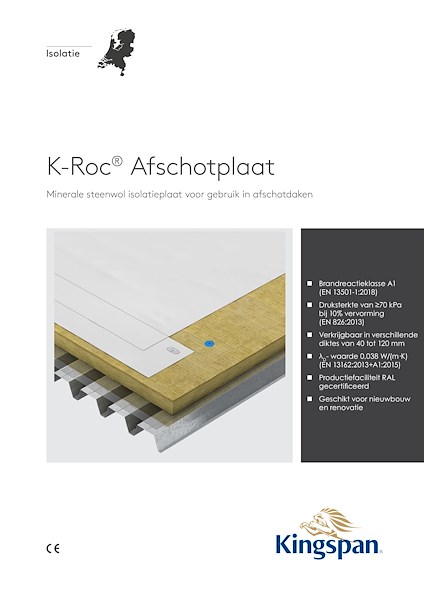 K-Roc Afschotplaat is een mono densiteit minerale steenwolplaat en heeft een standaardhelling van 2% om afschot te creëren. Dit afschot helpt om regenwater af te voeren en waterophoping te voorkomen. Het product heeft een brandreactieklasse A1 (EN 13501-1:2018) en is toepasbaar onder mechanisch bevestigde of losliggend geballaste dakbedekkingssystemen. Dit product is geschikt voor zowel nieuwbouw- als renovatieprojecten.