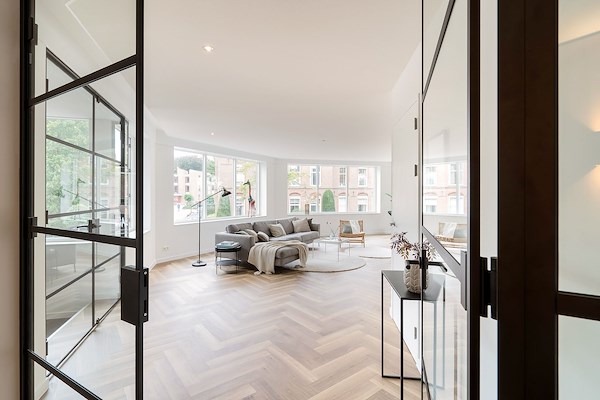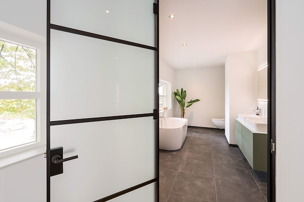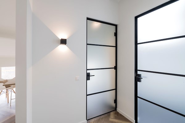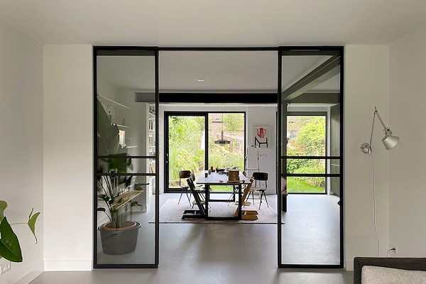 De glazen deur optimaliseert daglicht en zichtlijnen, waardoor een open en ruimtelijk gevoel ontstaat. De zwarte profielen met een fijne structuur dragen bij aan een tijdloze industriƫle uitstraling.