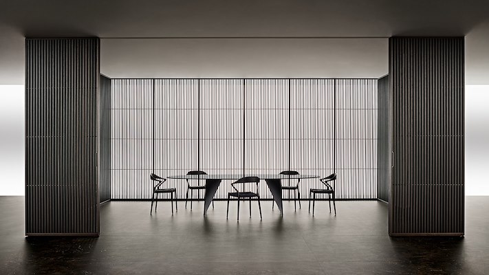 Rimadesio Syncro glaswand met verticale lamellen als schuifsysteem voor het verdelen van een ruimte