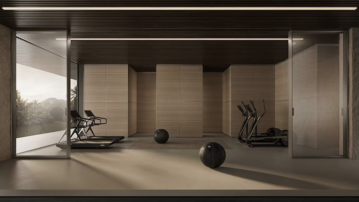 Rimadesio Syncro glazen schuifsysteem toegepast als transparante ruimteafscheiding in een wellnessru