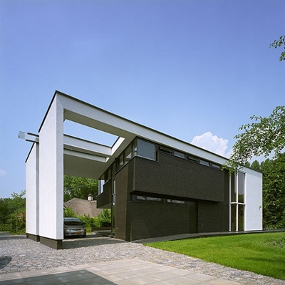 Dit woonhuis is gelegen op een door beukenhagen en ingeplante bomen omgeven kavel en bestaat uit een samenvoeging van twee zeer uitgesproken ontwerpelementen. Een in zwarte steen uitgevoerde woning met sculpturale vormen is onder een witgestuukte tafel geschoven. Het tafelblad, dat het dak vormt van de twee bouwlagen hoge woning, wordt aan de kopse zijden ondersteund. Aan de zuidzijde bestaat de ondersteuning uit een vrijstaande, gebouwhoge wand, waarachter zich een dubbele carport en de entree bevinden. Aan de noordzijde is de ondersteuning tot onderdeel van het woningvolume gemaakt. Inspiratie voor dit opmerkelijke ontwerp is gevonden in de kavelvorm, die vrijwel geheel omsloten wordt door hagen en zo een groene kamer vormt.