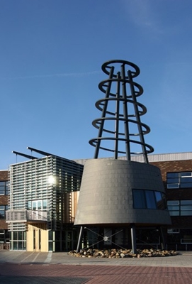 De muziekschool wenste een percussieruimte. Deze is ondergebracht in een losstaande en opvallende toren pal voor de hoofdentree. De toren is uitgevoerd met een grote etalage die uitkijkt op het entreeplein en visa versa. De toren kan zonder de rest van het gebouw functioneren, waardoor deze eenvoudig te verhuren is aan bandjes. Met de percussietoren krijgt de hoofdentree zeggingskracht, wordt de geluidsproblematiek eenvoudig opgelost en krijgt elke bezoeker een vleugje mee van de culturele activiteiten die zich in het gebouw afspelen.